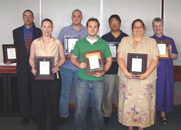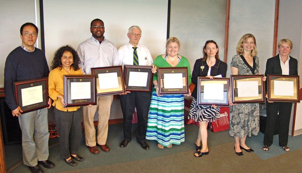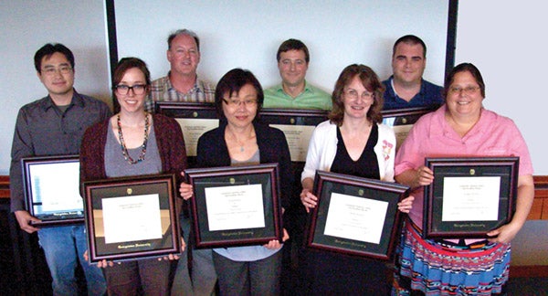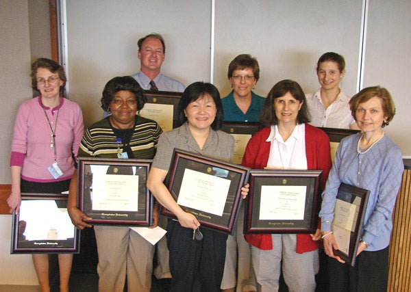 Back row (L to R): Scott Taylor (Team Spirit Award), Gene D’Andrea (Lauinger Library Award), Stephen Fernie (Lauinger Library Award, Team Spirit Award), Jill Hollingsworth (Kindred Spirit Award), Daunett Hemmings (Team Spirit Award), Gwen Owens (University Librarian's Award), Deborah Cook (University Librarian's Award)