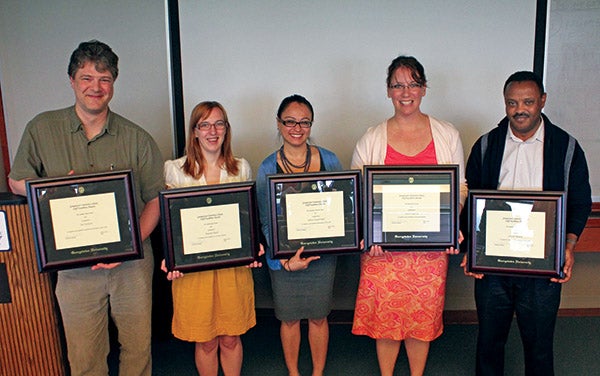 (L to R): Shian Chang (University Librarian's Award), Vivian Christian (Lauinger Library Award), Sandy Houston (Lauinger Library Award), Young Moon (Kindred Spirit Award), Scott Taylor (Kindred Spirit Award)
