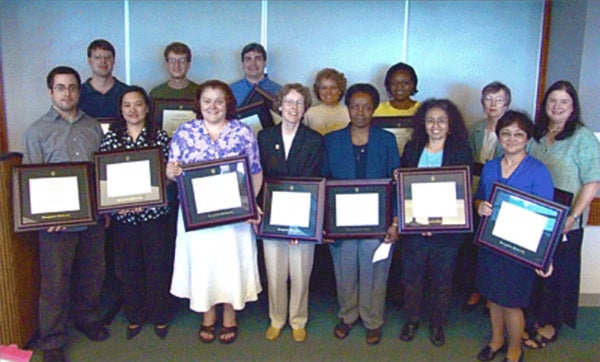 Front row (L to R): Jason Brock (Kindred Spirit Award), Claudette Villaverde (Lauinger Library Award), Deborah Critzer (Team Spirit Award), Sandy Hussey (Kindred Spirit Award), Sandy Houston (Team Spirit Award), Sandra Marroquin (Team Spirit Award), Lourdes Valle (University Librarian's Award)