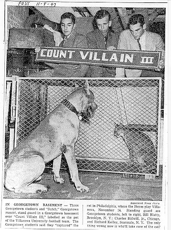 In 1947, Butch suffered one of the occupational hazards of collegiate mascots: he was kidnapped by a group of young "scholars" from Fordham. Happily, he was rescued by a group from Georgetown, including Neil McShane (B'50), Richard Kelley (B'50), Tom McHugh (B'50), and William Blatty (C'50, later of Exorcist fame). During the course of the rescue, they also managed to capture the new Fordham mascot, which was a ram whose horns had been clipped. According to the Washington Times-Herald, our intrepid quartet stopped at a veterinarian's office to confirm that the animal was in fact a ram. So much for a liberal education. Another clipping shows Butch greeting the Villanova mascot, then in the care of Blatty, Kelley, and Charles Bidwill (C'50), now President of Sportsman's Park Racetrack in Chicago.