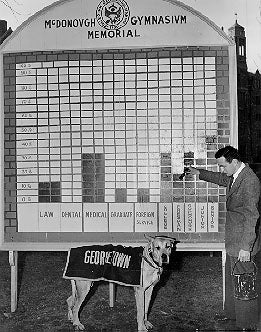 Unfortunately, space does not permit us to chronicle all the dogs of Georgetown. Before closing, however, we must salute "Duchess," who chose to make her home on the East Campus in the fifties; several generations of Observatory mascots, including "Max," who was banished for killing sheep on the Archbold estate; and the labrador who in the middle seventies taught most of the student body to play catch. Some of us thought he deserved a degree. Anyone with additional memoirs is invited to submit them to the University Archives.