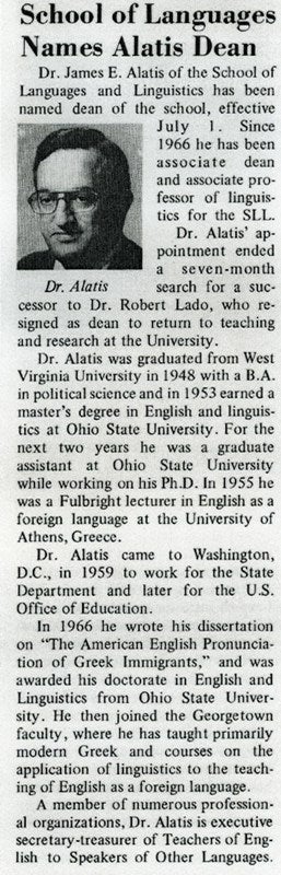 James E. Alatis came to the School of Languages and Linguistics in 1966 as Associate Dean. He resigned as Dean in 1994.