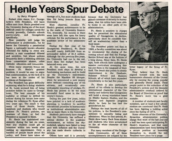 Robert John Henle, S.J., Georgetown’s 45th President, will leave office next June. Henle presided over the University during six of the most difficult years for colleges across the country generally, Catholic schools particularly, and Georgetown specifically . . .