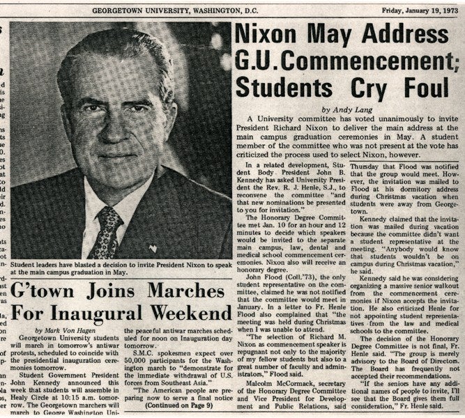 The decision to invite President Nixon to address graduates and to award him an honorary degree drew angry protests from student leaders who threatened a walk-out if the President attended. In April 1973, shortly before the resignations of presidential aides H.R. Haldeman and John Ehrlichman and the firing of John Dean (L’1965), President Nixon turned down the invitation and the University announced that the Most Rev. William Baum, Archbishop-elect of Washington, would be the principal speaker at commencement.