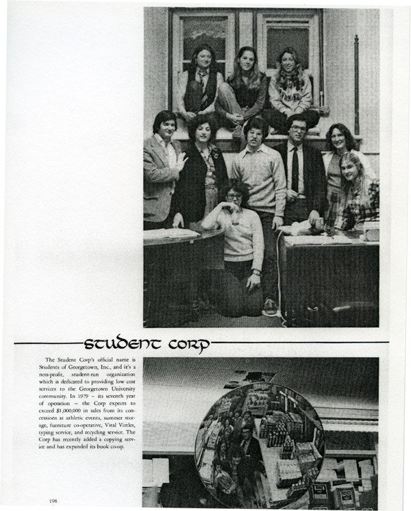 The Students of Georgetown, Inc. (or the “Corp”), a non-profit, student-run corporation, was chartered in 1972. Originally, it was meant to serve primarily as a “paper corporation,” providing the student body with a mechanism by which they could file suit against the University, if the need arose. However, it quickly became apparent that the Corp could provide a more useful service, that of providing for the basic needs of students on campus. Within its first year, the Corp developed numerous services, including a record co-op, a food co-op (Vital Vittles), and a shuttle bus.