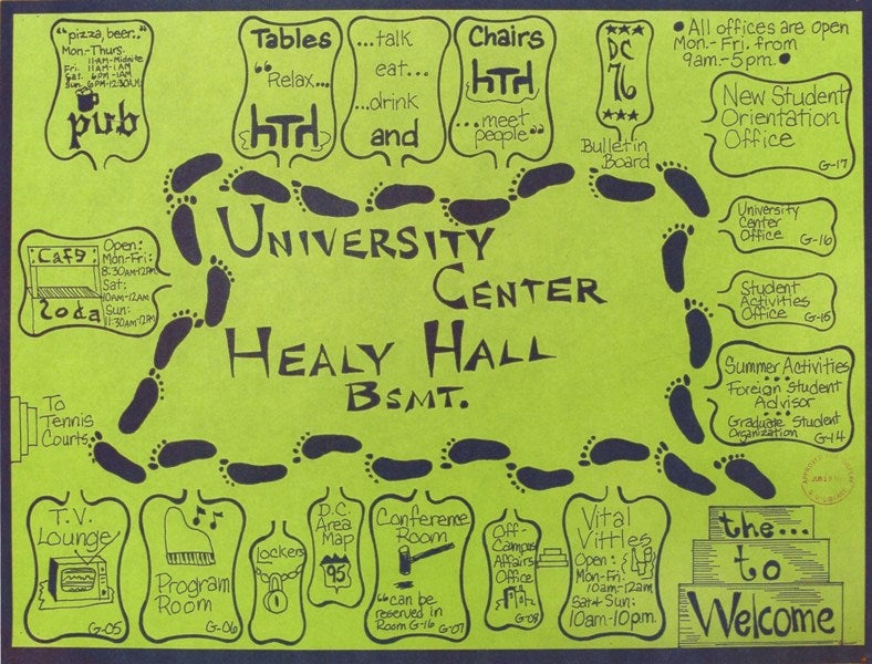 Located in Healy basement, the Center housed student government offices, conference halls, a television room, a coffee house, and a 70-seat theater. In 1974, the coffee house transformed into the Pub.
