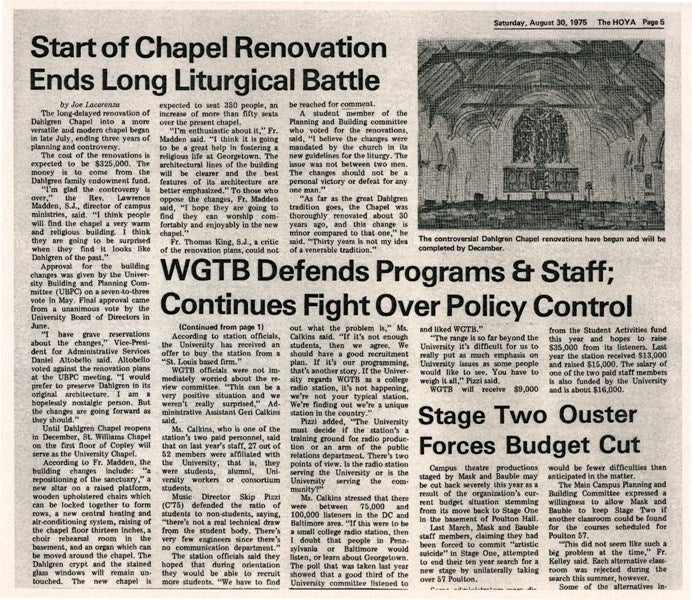 During the course of the 1970s, the station’s increasingly counter-culture perspective lead to clashes with the University’s administration, rumblings from the FCC, and a series of shut-downs. A rise in the number of non-Georgetown staff at the station lead to charges that WGTB was no longer Georgetown’s radio station and no longer served the student body. A 1975 poll of students found 412 in favor of shutting the station, with 293 opposed.