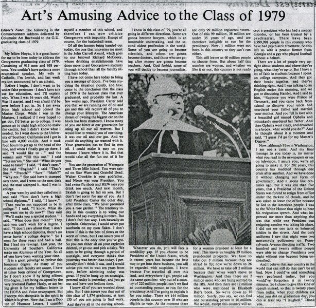 He received a standing ovation and commented that: Georgetown has surrounded me with many wonderful memories. When I returned here yesterday . . . I knew that I had left my heart here.