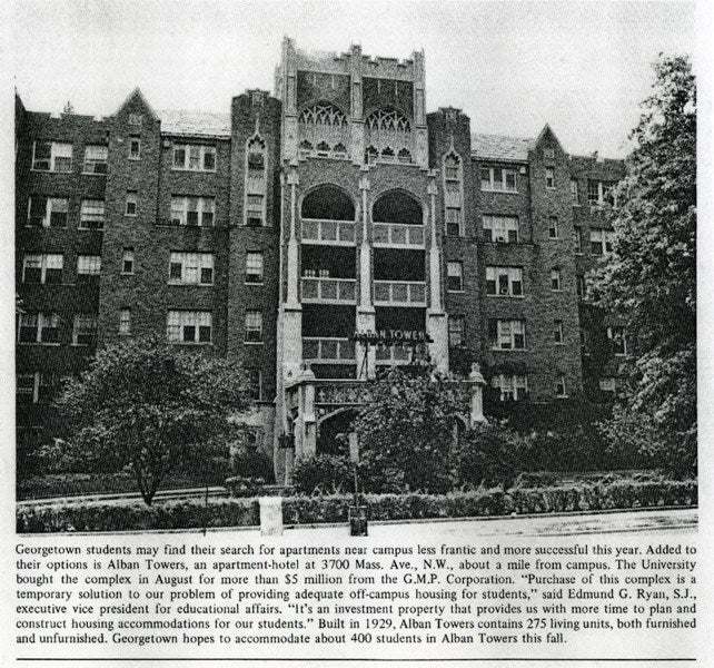 In 1973, the University bought Alban Towers, an apartment-hotel located at 3700 Massachusetts Avenue, N.W., to ease its student housing crisis. Around 320 students moved in at the beginning of the fall semester, joining around 100 sitting tenants who chose not to leave the building when Georgetown purchased it. The University would own Alban Towers until 1996.