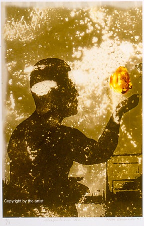 Seattle-born Tom Nakashima is an internationally established painter/printmaker who earned his M.F.A. from the University of Notre Dame in South Bend, Indiana. He has taught at Columbus College of Art and Design and Catholic University in Washington D.C., and exhibited in Japan, New York, and at Washington D.C.'s Anton Gallery, where he has been represented since 1985. Mr. Nakashima was recently appointed the William S. Morris Eminent Scholar of Art at Augusta State University in Georgia. Nakashima had created a series of paintings on Homer's mythical Cyclops before producing this engraving. Its subject is based on "the legendary one-eyed boy often pictured in Zen paintings, sweeping out the temple. According to the story, this mutant, or perhaps god, was often approached from the rear by children intent on teasing him... but when Hitotsumekozo swung around and cast his singular eye on them—they of course fled in terror."