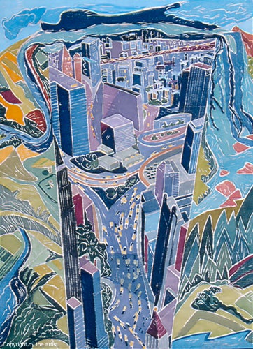 Leslie Garcia studied under Jack Perlmutter at the Corcoran School of Art and Jim Forbes at the University of Maryland, and has worked with her sister creating illustrations for children's books. Her whimsical aerial view of Washington, D.C. is an interesting contrast to Aline Feldman's color woodcut, Paradox of Place.