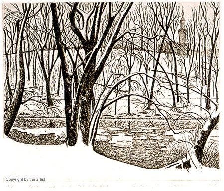 "Since 1976 I have studied a specific stretch of Rock Creek Park after every snowfall. With the white background the varied shapes of the trees become very visible. I am interested in the compositions and sculptural forms that are revealed after the leaves have gone and the snow has fallen. ...I look at the trees as if I thought I were the choreographer looking for the perfect dancer. The trees are my dancers, but like human beings some are better at it than others."The following statement accompanied Lindsay Makepeace's etching on the cover of the Winter 1989 issue of the Quarterly: