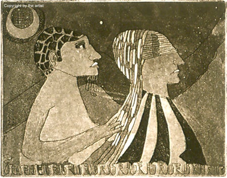 In Spirita/Spiritum, Susan Due Pearcy was inspired by the gilded icons she saw during a trip to the Soviet Union in 1986, and the empty frames once filled with holy images that had been destroyed under the rule of Communism. Pearcy received grants from the Maryland State Arts Council to finance the gold leaf and viscosity rollers she needed for a series called the "Icon Frame Series." Spirita/Spiritum, an etching and aquatint, marked a transition in this series. As she explained in the Quarterly, "My prints moved from being faceless heads with ornate frames to images with a personality and definition - the void became personified.... The prints evolved to address my own concerns for women and our lost history/image."