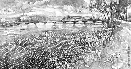 Virginia artist Elizabeth Peak has focused on landscape as her subject of choice. Peak works in traditional intaglio etching and monotype, and credits her confidence as a printmaker to her teachers Gabor Peterdi and Alan Shestack at Yale University. Peak prefers to draw directly from nature onto the etching plate, which results in a reversed image when printed onto paper. In this scene, the Episcopal Cathedral in Washington glimpsed from Memorial Bridge would in reality appear on the right instead of the left hand side of the picture as we see here. The etching was selected for the Quarterly cover from the Prints: Washington exhibition sponsored by the Washington Print Club in the summer of 2000.