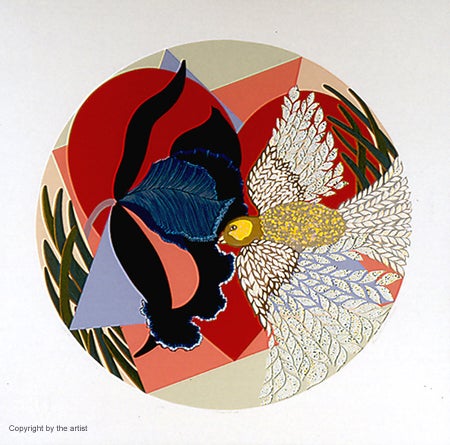 Terry Parmelee studied printmaking in Tokyo in 1957, and in Paris with American woodcut artist Carol Summers. One of Washington's most respected artists, she recently published a Catalogue Raisonné of her entire repertoire of prints since 1966. Parmelee is also known for her colorful, abstract acrylic paintings initially influenced by the Washington Color School painters of the 1960s. Her favorite woodcut artists, Un'ichi Hiratsuka and Shiko Munakata, inspired this print, commissioned by the Washington Print Club for its first illustrated Quarterly cover in 1984.