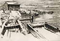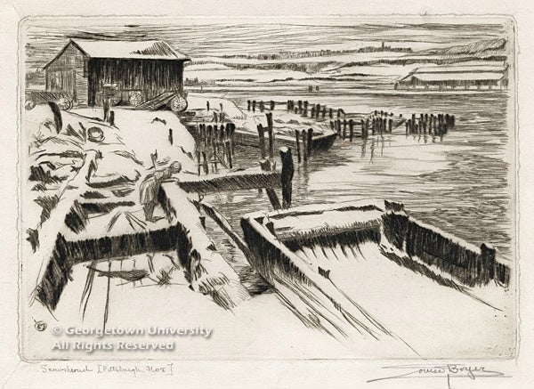 Snowshroud is Louise Boyer’s first successful impression printed from an aluminum plate. It would be the first of twenty-two aluminum drypoints in the Pittsburgh Series. These prints serve as a record of industrial life along the banks of Pittsburgh’s Monongahela River—its mills, laborers, and their houses. Louise Boyer once said, “I think Pittsburgh is the most complex and dynamic city in America.”