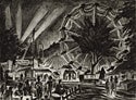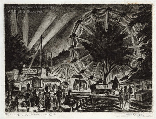 Fireman’s Carnival provides a unique perspective into the Pittsburgh Series. While the other prints focus on the interaction between architecture, industry, and leisure activity, Fireman’s Carnival emphasizes Pittsburgh summer nightlife. Boyer’s illuminated atmosphere is evoked through deep contrasts between lights and darks created by areas of carefully selective cutting of the plate.