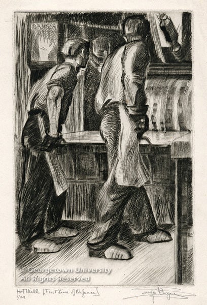 This print was one of two Boyer prints featured in the Artists for Victory exhibition held at the Library of Congress in 1983, depicting America during World War II. Curator Ellen G. Landau commented that the print “attests to the strong feelings Louise Boyer had about the steel industry in her native Pittsburgh and to her conviction about the importance of the work done by American industry in helping to win a global war.”