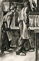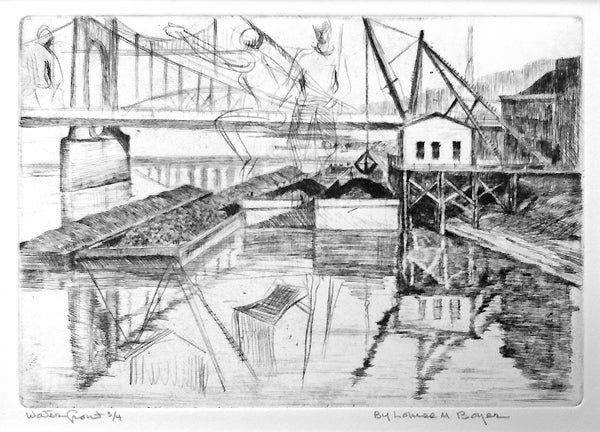 The Boyer women created a visual psychology with their prints. Although they moved to Maryland, New Jersey, New York and finally Missouri, their hearts always remained in Pittsburgh. In Waterfront Louise Boyer juxtaposes the rawness of the coal industry with the contours of three gigantic men working on a steel bridge. The artist is commenting on the relationship between man, machine, and American urbanization.