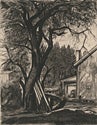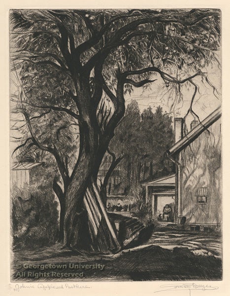The Pittsburgh Series not only provides scenes of recognizable landmarks but also a narrative quality. Johnnie Appleseed, the last in the series, is a welcoming look into the artist’s life. The Boyer family house is depicted in the background. However, it is the apple tree that dominates the print’s foreground. According to family legend, pioneer gardener Johnny Appleseed, who visited Pittsburgh during his missionary trip into the American frontier, planted an apple tree in the Boyer’s backyard.