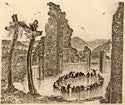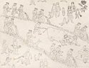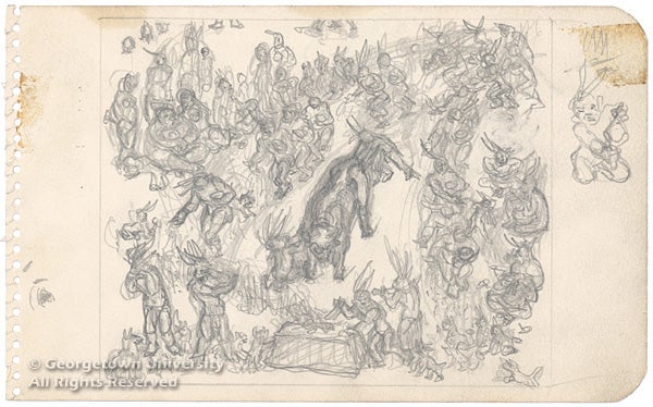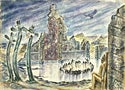 The print and watercolor for Peace Table II are two of several works made during the 1940s which comment on America’s involvement in World War II. In her Nov. 13-14, 1984 oral interview with the artist, Helena Wright, Curator of Graphic Arts at the Smithsonian’s National Museum of American History noted that Ms. Boyer’s works from this period “are the strongest in satirical comments because [she] provides an edge to observation in war related prints.” The title is taken from a verse in the Bible. The artist alludes to past world conflicts amongst nations and their ultimate demise. The silhouetted figures, set against a crumbling wall depicting past civilizations and present dictatorship power (Hitler within the stained glass), argue for peace in the foreground.