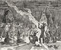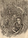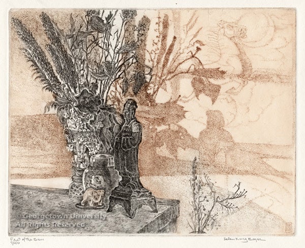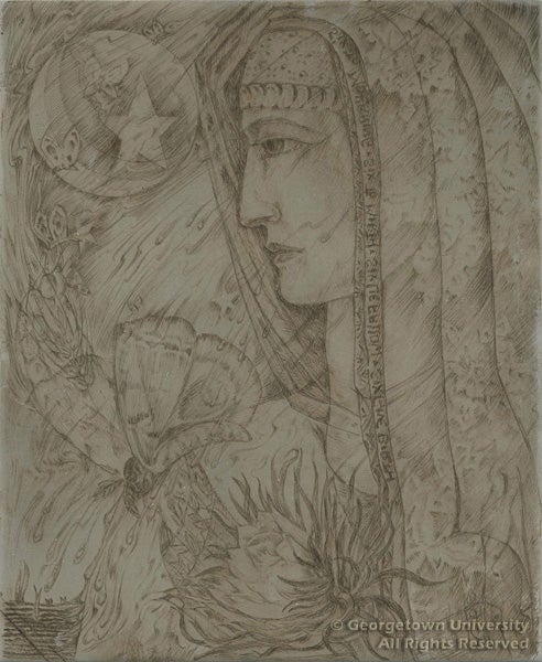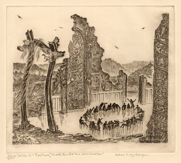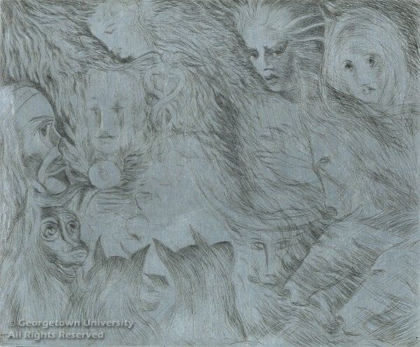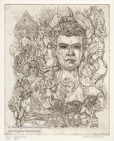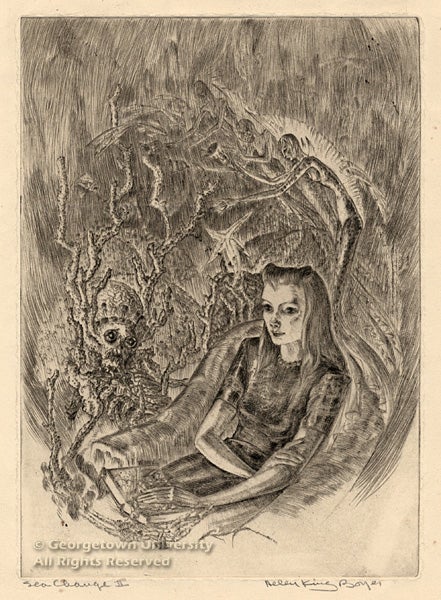 Helen Boyer never identified with a specific religious denomination. However she was an avid reader of the Bible and other spiritual texts from different cultures. She looks at ideas on Creationism, as seen in this print. The artist combines a stippling and organic composition with the drypoint needle to create an illuminating theatrical setting.
