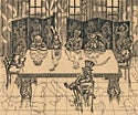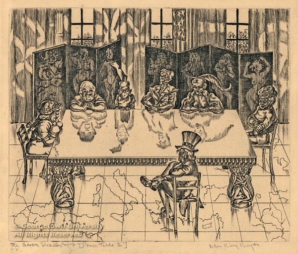 Peace Table I shows individuals gathered at a table, each representing a country involved in the war. Uncle Sam sits with one arm holding his head as he listens. Byōbu (Japanese folding screens) block their meeting from the outside world. Each panel illustrates one of the seven deadly sins, and reflects the mixed emotions expressed by the differing political, social, and economical viewpoints of each nation.