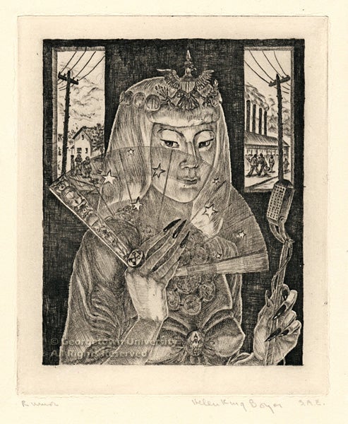 These two wartime prints reflect on communication. In Rumor the artist refers to Tokyo Rose, a generic name given to female broadcasters of Japanese propaganda. The jewels around her neck are chiseled with seals representing labor unions, organizations, and the Papacy. Her alluring monarchical looks deceive her viewers and listeners. The initials S.A.E. at the bottom right denote the artist’s membership in the Society of American Etchers. American etcher John Taylor Arms, then president of the society, frequently corresponded with the Boyers, who were both admitted in 1943.