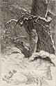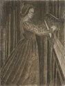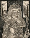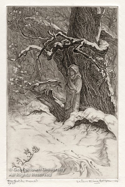Du Holde Kunst is a complex multilayered print. The title refers to Austrian composer Franz Schubert’s romantic German song An die Musik (To Music). The hymn is to the art of music, but Helen Boyer does not create a scene that alludes to harmonious notes. Instead she depicts a lonely woman, outside by a tree during a frigid winter snow storm. She is wrapped in a cloak and her eyes are closed. The print is also autobiographical. Franz von Schober wrote a poem that accompanied Schubert’s music. He looks at music being the quintessential transcendental experience from the everyday world. For Helen Boyer, the arts were her escape during the years of her childhood illness and growing up during the Depression.