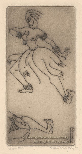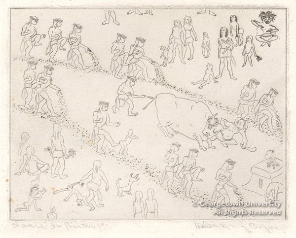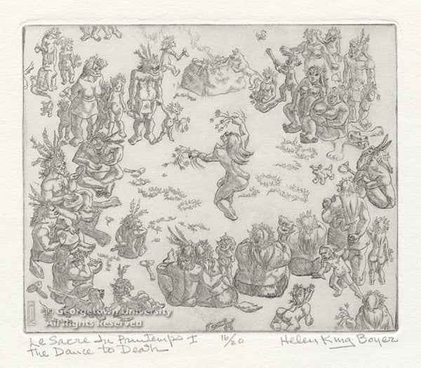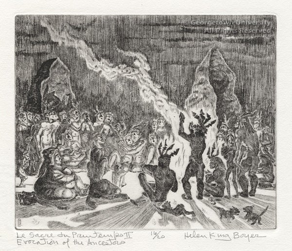 Le Sacre du Printemps (The Rite of Spring) premiered in Paris in 1913 with music by legendary composer Igor Stravinsky and choreography by Vaslav Nijinsky. Helen Boyer created a set of four prints, each portraying an iconic scene from the ballet. These prints are at times satirical in the artist’s caricatured portrayals of the primitive inhabitants. However, they also serve as childhood synesthetic nostalgia. In 1930 the U.S.-staged version of Le Sacre du Printemps opened in Philadelphia under Leopold Stokowski’s direction with modern dance pioneer Martha Graham performing the principal role of the sacrificial virgin.