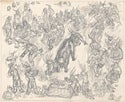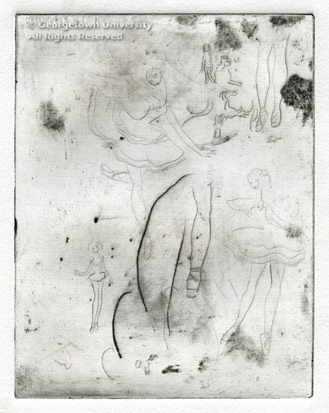 As a child, Helen King Boyer spent hours looking through magazine pictures of dance performances, especially those of the Ballets Russes. She was fascinated with the company’s choreography and music. In her early years Helen Boyer designed costumes for her dolls inspired by various ballets. This print is the first concept in Boyer’s Sacre du Printemps suite, made when the artist was only thirteen years old. The second image shows the back side of the aluminum printing plate, where Helen made some preliminary ballet-focused sketches that were later discarded in favor of a richer narrative approach.