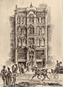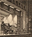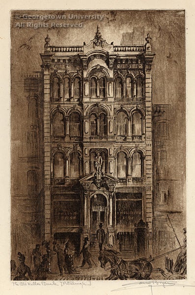 The Old Mellon Bank states I and II are prime examples of how the Boyer women worked together as a mother-daughter printmaking team. The Boyers were commissioned to etch an image for a brochure for the Mellon Bank. Louise Boyer designed the building’s facade and Helen Boyer etched the figures and chariot in the foreground. However, as we see in the second state of the print, the Boyers were asked to remove the people because the client decided to concentrate on the building’s architectural and commercial significance.