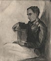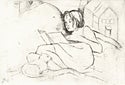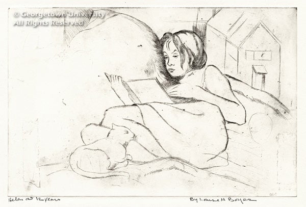 This set of prints invites the viewers into the Boyer women’s personal lives. Helen at 12 is an early example of Louise Boyer’s use of drypoint on aluminum. Simple contours form the reclining body of the artist’s daughter while she reads a book. Most of the artist’s efforts are placed on Helen’s pensive expression.