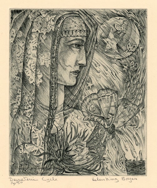 Helen Boyer’s artistic training came not from the classroom but on personal observation and retentive memory. She spent hours closely studying the anatomy of her various toy figurines. As the daughter of etchers who had a printing press at home, she taught herself that process by age fifteen. A year later she had her first solo show at the Gulf Building in Pittsburgh.