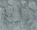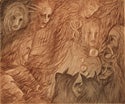 Louise Boyer did not rely on the spontaneity of the melted wax crayon to form her images. As Helen Boyer comments, “[Mother] took the accidental out of her prints. She came up with multiple plates shaped to her will.” Here, the artist paid close attention to the many faces that Siddhartha will meet before achieving enlightenment. (Siddhartha is the spiritual teacher on whose teachings Buddhism was founded.)