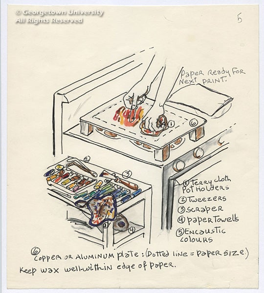 The Boyers had frequent demonstrations on encaustic printmaking in their own kitchen. Members from the community and various arts organizations joined the Boyers in producing unique miniature impressions. They preferred simple, everyday materials such as blank pages for collecting stamps, and children’s crayons.