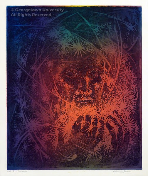 This aquatint is one of several versions in the Georgetown Art Collection. Similar to traditional etching, this technique uses acid to create marks on the plate. But instead of using a needle to make lines, aquatint uses powdered resin that is acid resistant on the metal to make tonal effects. For this print, one blank plate was painted with sweeps of multiple colors, and then a second plate containing the image was printed in black. The end result is a luminous and arresting image.