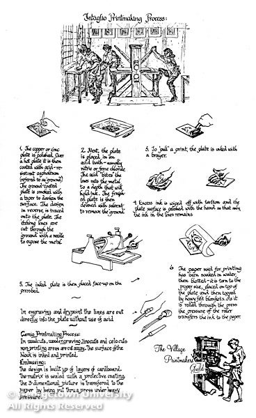 The Boyer women began printing their aluminum plates in the early 1930s in Pittsburgh. Noted Alcoa architect and engineer Pierre Hogner introduced the anodized aluminum plates to Louise Boyer as a substitute for traditional copper and zinc matrices. Using anodized aluminum plates eliminated the need for the ground coating used on copper or zinc plates, as well as the immersion in acid required to carve out the etched lines on plates of those metals. Most importantly, aluminum was lightweight, durable, flexible, and inexpensive. Hogner, who patented the aluminum printing plate in 1937, proposed “if an aluminum or aluminum alloy plate… is provided on its surface with a suitable aluminum oxide coating and the desired design is subsequently produced thereon, the difficulties heretofore encountered are minimalized.” The anodized coating was simply created by immersing the aluminum plate into an electrolyte bath, where oxygen ions were released to combine with aluminum atoms to produce a surface that is pure and hard. Thus the specially coated plate could withstand several runs through the press without affecting the design.