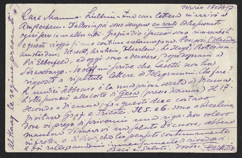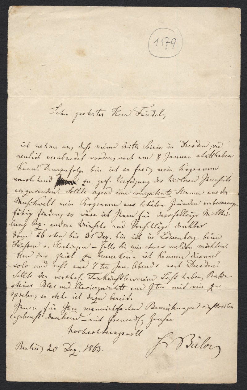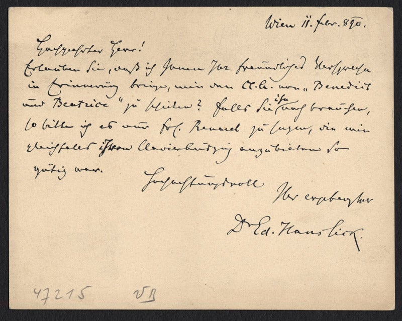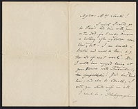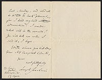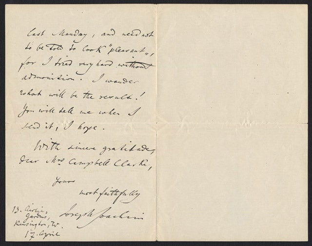 Joachim deeply valued the virtues of civility, which is revealed in this letter to “Mrs. Campbell Clarke,” the wife of an English music critic. Joachim regrets that he will not be able to visit with Mrs. Clarke (and “Rubinstein, the Sympathetic”) while she is staying in Paris. Personal connections like this facilitated the musician’s growing fame in England at the turn of the century. In 1904 the English poet Robert Bridges published a sonnet “To Joseph Joachim” in the London Times (17 May) in celebration of the violinist’s Diamond Jubilee.