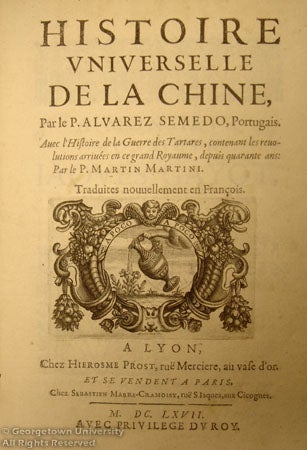 [par Alvarez Semedo. Portugais. Auec l'Histoire de la guerre des Tartares, contenant les reuolutions arriuées en ce grand royaume, depuis quarante ans: par le p. Martin Martini. Traduites nouuellement en françois]. Originally published in Portguese and intitled Relação da Propagação da Fé no Reyno da China e outros adjacentes (Account of the Propagation of Faith in the Kingdom of China and others adjacent to it, Madrid, 1641), this text was translated first into Spanish by Manuel de Faria e Sousa (Imperio de la China..., Madrid 1642), and then into Italian (Rome, 1643). This translation is the second version in French of Semedo's Account... of the great and renowned monarchy of China. See description of “The History of China – English”.