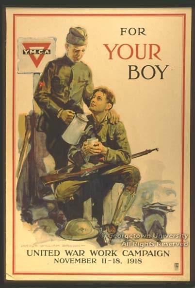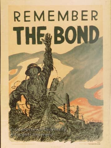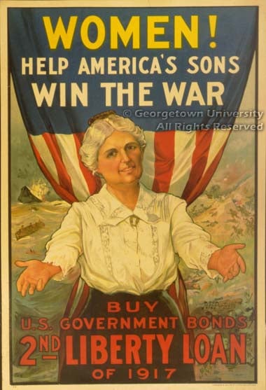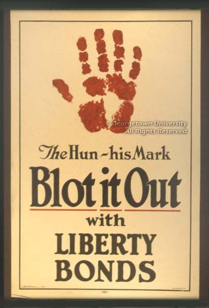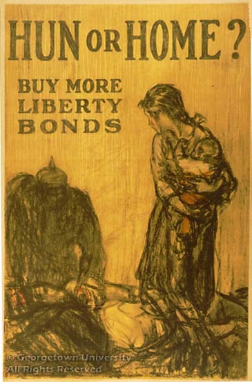 A large number of artists were involved in the creation of posters during the war. Some of them came to the work with their reputations already secured through their commercial work in books, magazines, and advertising: of these, for example, Howard Chandler Christy and James Montgomery Flagg are represented in this exhibition, Harrison Fisher and Edward Penfield are not. Some of the artists in the exhibit are now known to us largely because they did these—and other—posters. “Ruttan” and the euphonious “H. Blyleven Esselen” defeated attempts to track them down in the reference resources at hand; John E. Sheridan, who might well be a mystery elsewhere, is known here because he attended Georgetown in the closing years of the 19th century and his first poster work was probably the series he did advertising Georgetown baseball games against Princeton, Yale, Virginia, and Pennsylvania. As in Britain, some posters took advantage of work first published as cartoons in the daily papers; the examples shown here by W. A. Rogers and Oscar Cesare are typical. Many of the artists, whether obscure or famous, contributed their work gratis to the war effort.