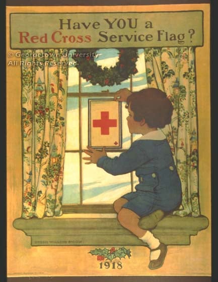 The posters helped not only with the obvious aim of recruiting members for the armed forces, but with the parallel home-front efforts embodied in various conservation efforts, in the multiple aims of the United War Work Campaign, in the work of the Red Cross, and perhaps most notably in the rapid subscription of the Liberty and Victory loans. Each of the four Liberty loan campaigns (two in 1917, two in 1918) and the Victory loan campaign of early 1919 brought an outpouring of poster art on both the local and national levels. Of the six posters in the exhibit not listed in Theofiles’ book, three relate one way or another to recruiting, and the other three are loan appeals.