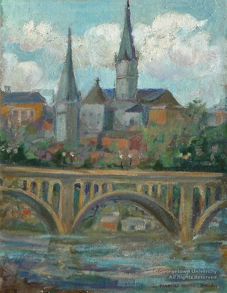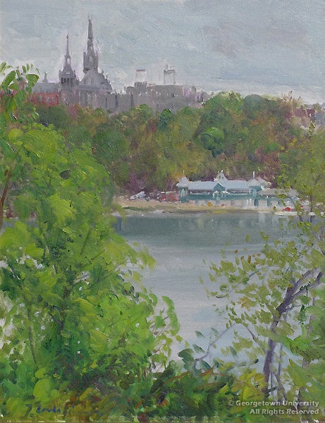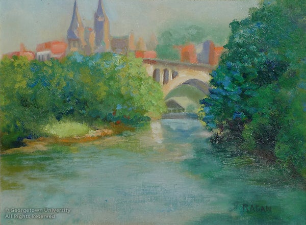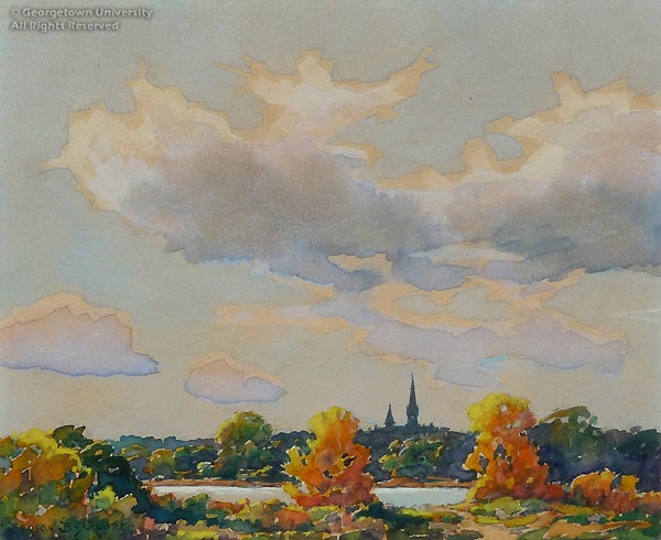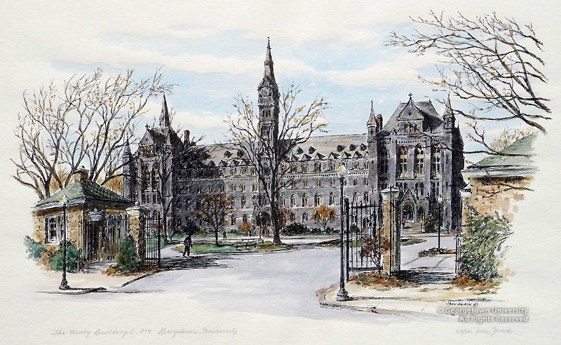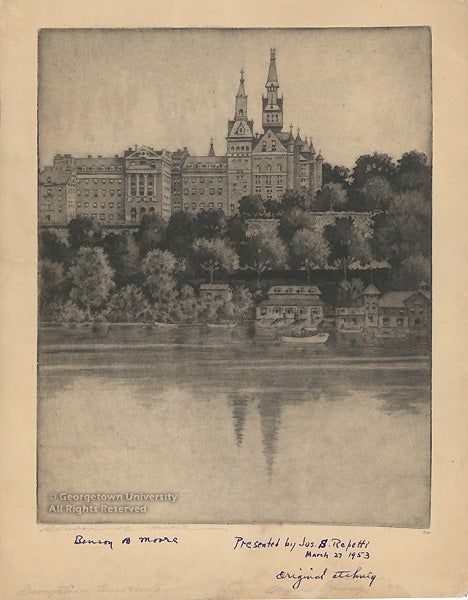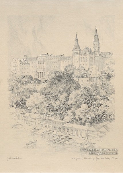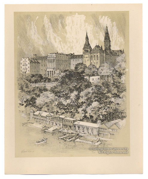 With Georgetown Impressions, the art collection celebrates several recent acquisitions, displayed to coincide with the John Carroll Weekend in late April. This major alumni event which meets in a different city each spring will be convening in Washington, D.C., for the first time in twenty years. The exhibition is drawn primarily from the University Art Collection, with some related selections from the University Archives. Several of these historic views have never before been exhibited at Georgetown. With approximately 32 prints, 9 paintings and other associated objects, the Special Collections Research Center reveals a prominent, yet little-known aspect of its collecting efforts from the past several decades.