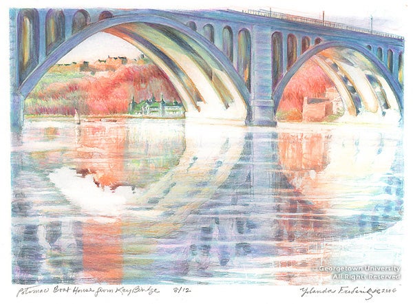 With its autumn 1985 issue, The Washington Print Club Quarterly celebrated the ninetieth birthday of the distinguished Japanese woodcut artist Un'ichi Hiratsuka, who had lived in Washington since 1962, where he inspired and taught a generation of younger printmakers. Hiratsuka was honored in the exhibition Hiratsuka: Modern Master, at the Art Institute of Chicago in 2001, and featured in the exhibition of Japanese Ukiyo-e art at the Library of Congress the same year. His personal statement about this lovely woodcut view from Key Bridge follows: