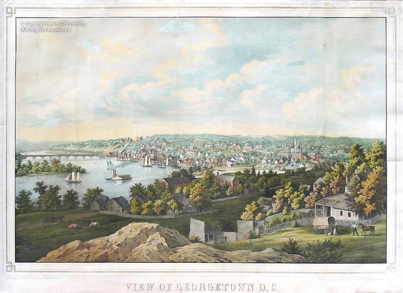 This scenic, distant view of Georgetown shows its clustered buildings and churches from a hilltop perspective, with the ships circling in the Potomac on their way to and from the bustling commercial port. The lithographer, Edward Sachse, was a native of Germany who immigrated to America in the late 1840s. He and his brother Theodore established a successful commercial lithography firm in Baltimore which produced these tremendously popular “bird’s-eye” panoramic views up until Edward’s death in 1873. Since they predate the advent of photography, these views are highly prized for their historical accuracy in capturing the dwellings, buildings and topography as they appeared at the time.