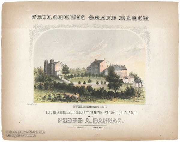 This small color lithograph, like the Observatory engraving in the Catalogue (below), is probably derived from an 1830s painting by James Alexander Simpson, the first instructor of drawing and penmanship at the college. Two of Simpson’s college landscapes are on view in Carroll Parlor (107 Healy Hall), while three others are hanging in administrative offices. The lithograph was originally printed on the sheet music cover (later cut out) of The Philodemic Grand March by Pedro A. Daunas. The illustration shows the campus from the northwest with Old North pictured to the left and Old South (the first building on campus), Mulledy and Gervase to the right. Founded in 1830, the Philodemic Society is one of the oldest collegiate debating clubs in the country.