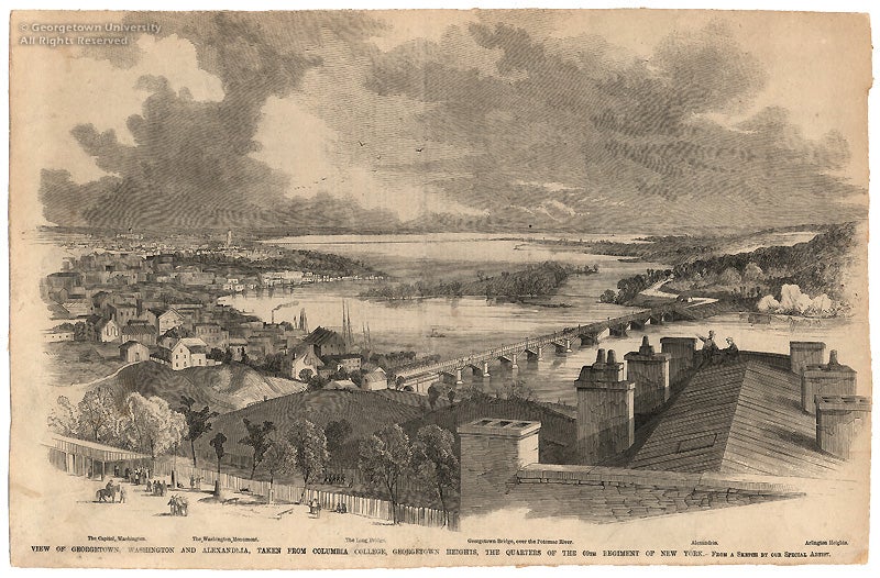 These wood-engraved views of Georgetown during the Civil War were published in the popular periodicals of their day. The Harper’s Weekly image shows the 69th Regiment, New York National Guard in front of the building that preceded Maguire, where they arrived on May 4, 1861. As recorded in John Gilmary Shea’s History of Georgetown College (1891), these troops arrived at Georgetown, which provided commanding views of the surrounding city and countryside from upper-level windows, on the same day that the United States Government notified its president, Father John Early, of their imminent occupation: