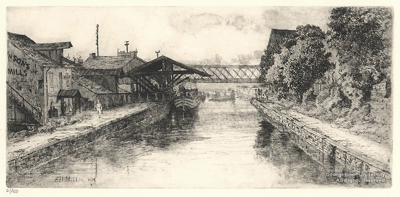 Eleazer Hutchinson Miller’s obituary at the age of 90 hailed him as “the first artist of national reputation to establish his home and studio in Washington.” Noted primarily for portraiture, Miller also became fascinated with the medium of etching on copper, and frequently exhibited with the New York Etching Club. This 1881 view along the Chesapeake and Ohio Canal in Georgetown shows buildings belonging to a flour mill along the south bank. The two impressions displayed here were printed in 1984 from Miller’s original copper plate in a restrike edition of 50 prints by Pittsburgh artist Helen King Boyer.