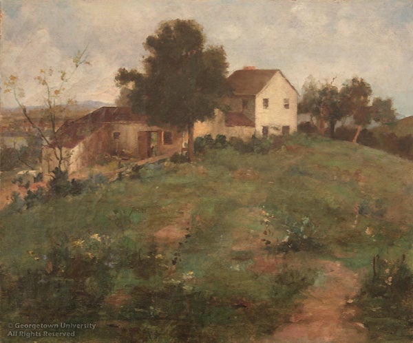 The painting presents an intimate, pastoral view of a small farmhouse and some of its outbuildings. A tall cedar tree stands in front of the house, and apricot trees are seen behind. The foreground shows a meandering path bordered by grasses and flowering wild garlic. In the far background the Potomac can barely be discerned. Although the original location of the house can’t be definitively determined, it was surely within sight of Georgetown’s Astronomical Observatory. The Observatory was built in 1844 and co-existed with small farms on the hill for quite some time, as can be seen in this early photograph (below) from the University Archives.