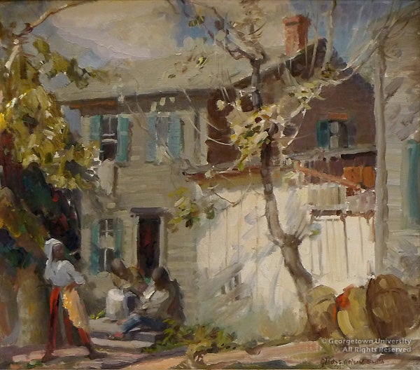 Smith became interested in the neighborhood of Georgetown and made a series of ketches and paintings of its historic homes and quaint narrow streets. Her painting Stoop Sitting in Old Georgetown was exhibited at the artist’s 1984 Corcoran Gallery retrospective and was purchased by the University in 2001. As curator Linda Simmons wrote in the exhibition catalogue, “the landscape elements of curling tree branches and a rough board fence are given further pictorial quality by the figures on the stoop and the bedding hung out to air, events not to be seen so often today.”